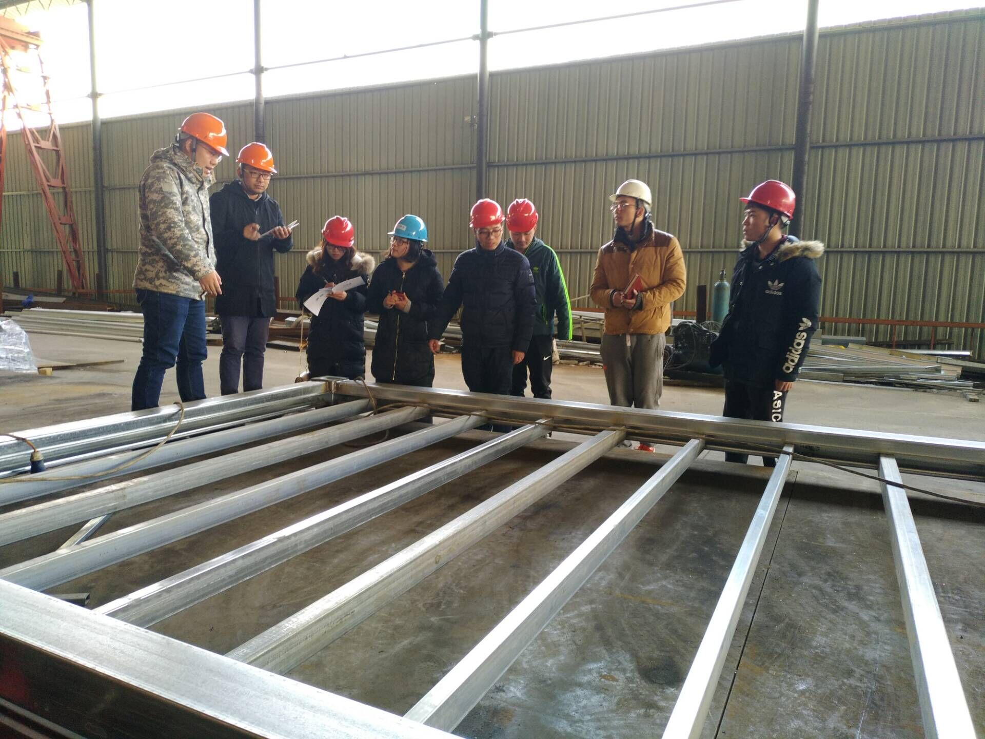 3. 成品展示:學(xué)習(xí)完樣品知識後,一行人來到廠區進行實物成(chéng)品的學(xué)習。製作好(hǎo)的頂底材料,牆板,以及德國的打(dǎ)包箱項(xiàng)目(mù),曹總監都事無(wú)巨細的為我們講解。