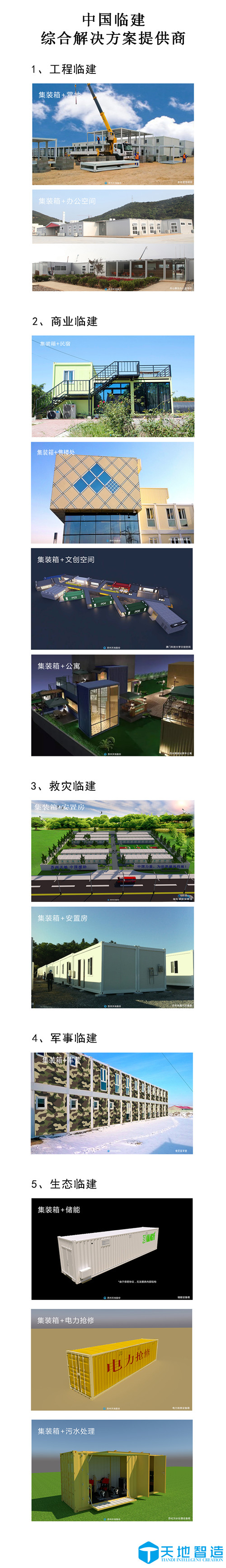 作為中國臨建綜合解決方案提供商,蘇州草莓视频IOS下载始終致力於臨時建築的(de)創造與探(tàn)索,並率先提出“中(zhōng)國(guó)臨建”的(de)概念,以集裝箱為主體,形成了能夠滿足客(kè)戶不同定製需求的(de)五大臨(lín)建(jiàn)係列產品:工程臨建(jiàn)、商業臨建、救災臨建、軍事臨建和生態臨(lín)建(jiàn)臨建。