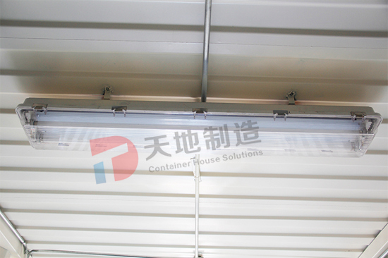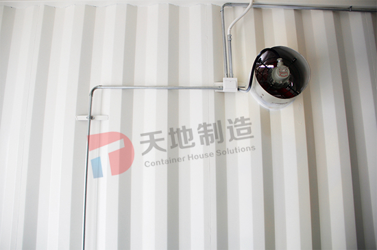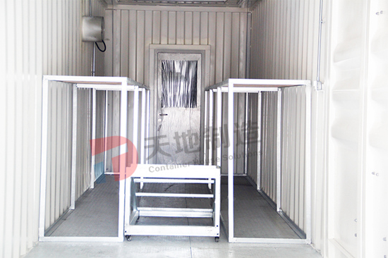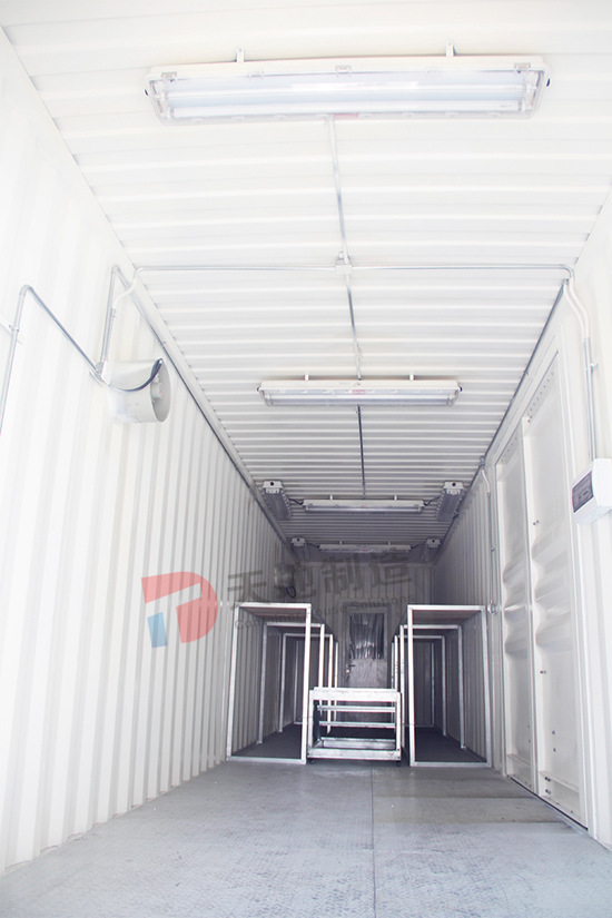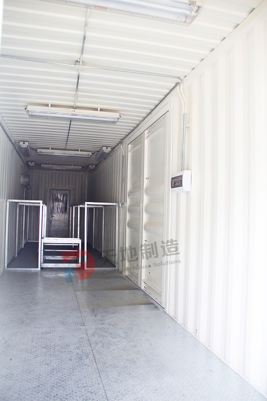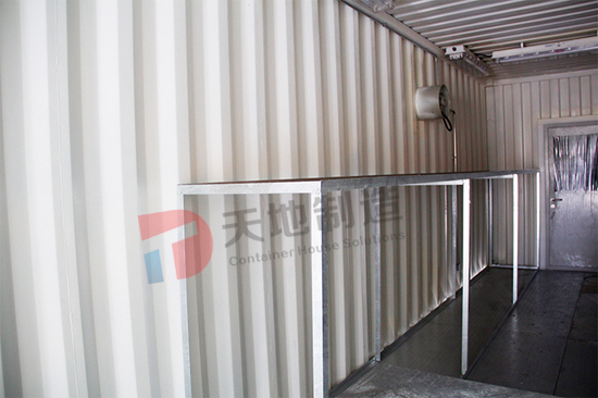 設備箱總麵積90㎡,用3個海運箱左右延伸而(ér)成一個狹長的倉庫。倉庫腹地(dì)安置貨物架,配備照明(míng)設備,且留(liú)有(yǒu)足夠的存儲空間。